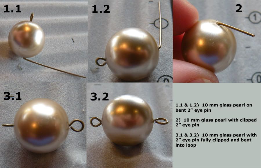 Once you have your chains and all your materials ready, it's time to make the pendant assembly. You'll need the 10 mm glass pearl, the pendant, and one of your 2" eye pins. Thread the eye pin through the bead. Look at the eye (loop) that's already been made for you. Pay attention, because THIS is the most confusing part! You want the eye that you are making to be going in the opposite way that the pre-made eye is. In other words, if you are looking at the pre-made eye and you see the actual loop looking like an open circle- O - you want the one you are making to look like a line - | ; this is so that you can properly hand the pendant from the necklace later [Figs 3.1 & 3.2].