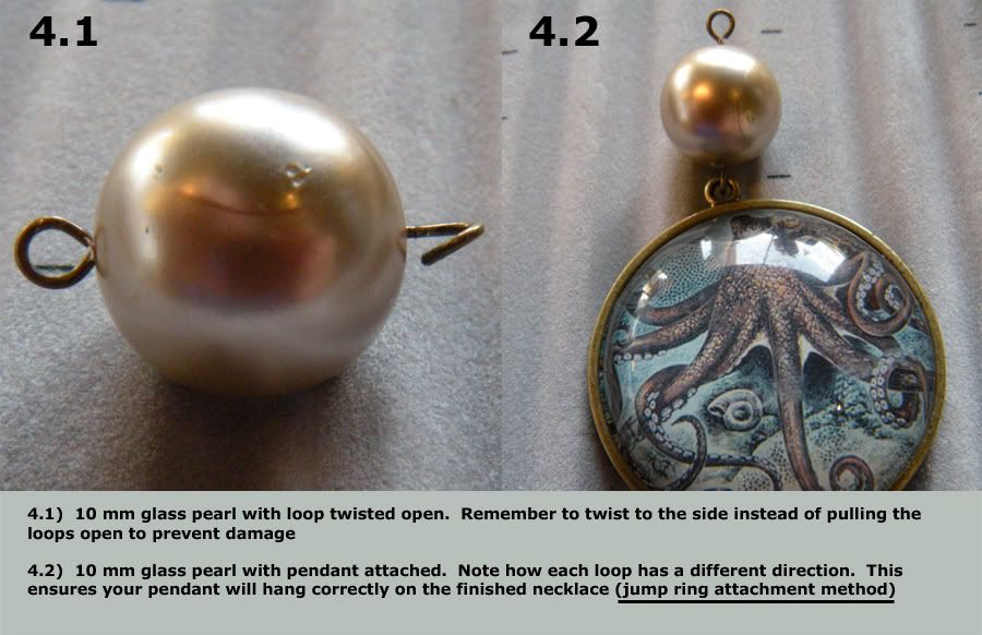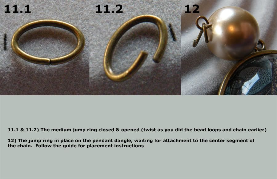 Once you have the necklace completely made, take your pendant assembly and the larger jump ring. Twist the jump ring open- enough to fit over your chain [Figs 11.1 & 11.2]- and hook your pendant assembly by the unoccupied eye loop of the 10 mm pearl [Fig 12]. Now comes the fun part... Which hand do you usually use to open necklaces? Generally, whichever hand you are normally used to writing with (right-handed for me) is the one preferred for opening clasps on jewelry. To make sure the clasp is on the right side for you and the pendant is facing the correct way, follow the below instructions: