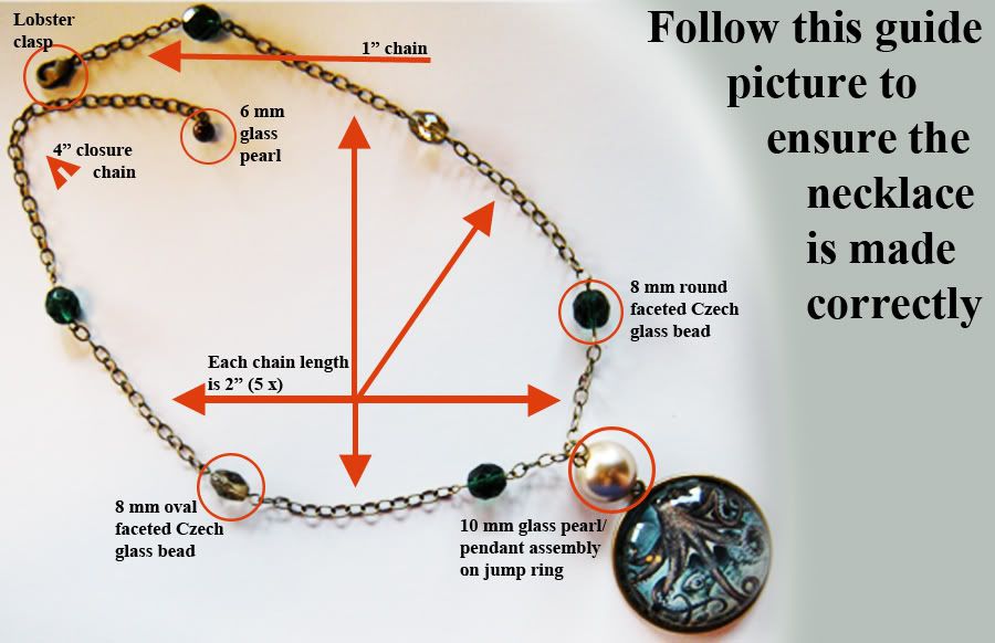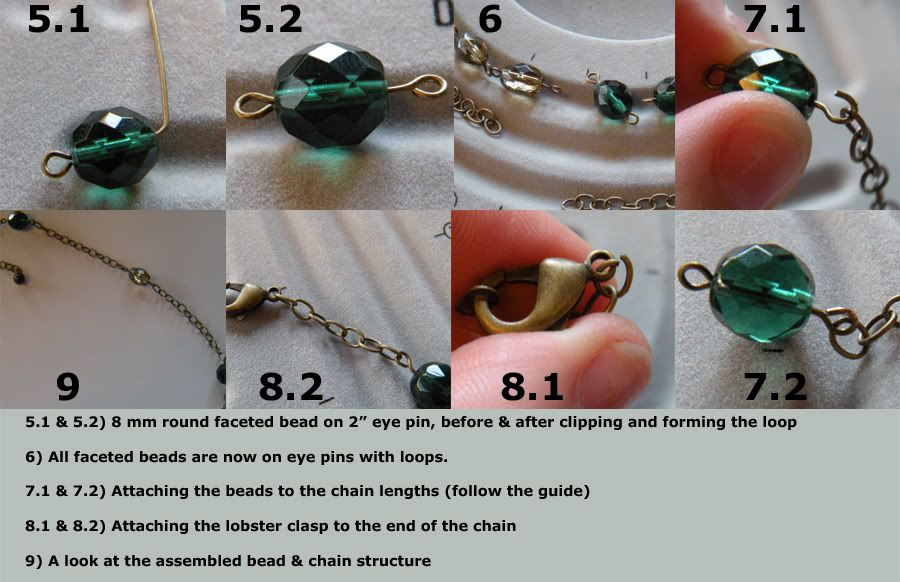 Following the guide, begin to assemble your necklace. I find it easier to to one side at a time- you might be more comfortable building each side in tandem. Open the eye as you did to attach the pendant to the 10 mm pearl, and hook one end of the chain [Fig 7.1]. Close the eye [Fig 7.2] and continue to build the necklace, adding the beads in the order indicated on the guide. On one side, after the last round faceted bead, attach the 1" length of chain. On the other side, attatch the 4" length. On the 1" chain, twist open the last link in the chain and use it to hook the lobster clasp [Fig 8.1] then twist it closed [Fig 8.2]. When you are finished, you should have a structure similar to that in [Fig 9].