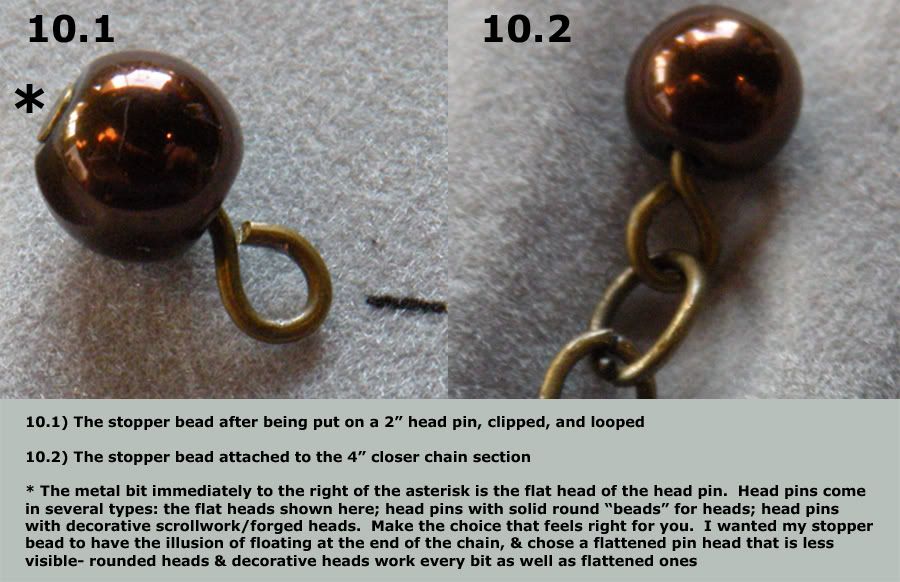 Get your 6 mm glass pearl and your head pin to make the stopper for the closure chain. Thread the head pin through the pearl, and clip/roll until you have an eye loop [Fig 10.1]. Twist open the eye loop on your stopper, then attach it to the end of the 4" length of chain and twist it closed [Fig 10.2].